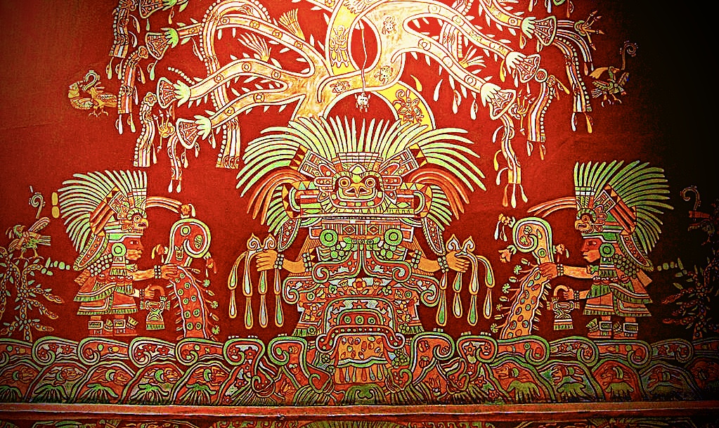 Illustration : "Grande déesse de Teotihuacán", peinture murale découverte dans le complexe de Tepantitla à Teotihuacán au Mexique et datée entre -100 et 700. On pense qu'il s'agissait d'une déesse de l'inframonde, de l'obscurité, de la terre, de l'eau, de la guerre et de la création. On distingue sur cette fresque des plantes et champignons hallucinogènes. Image modifiée à partir d'une photo de Thomas Aleto CC BY 2.0.
