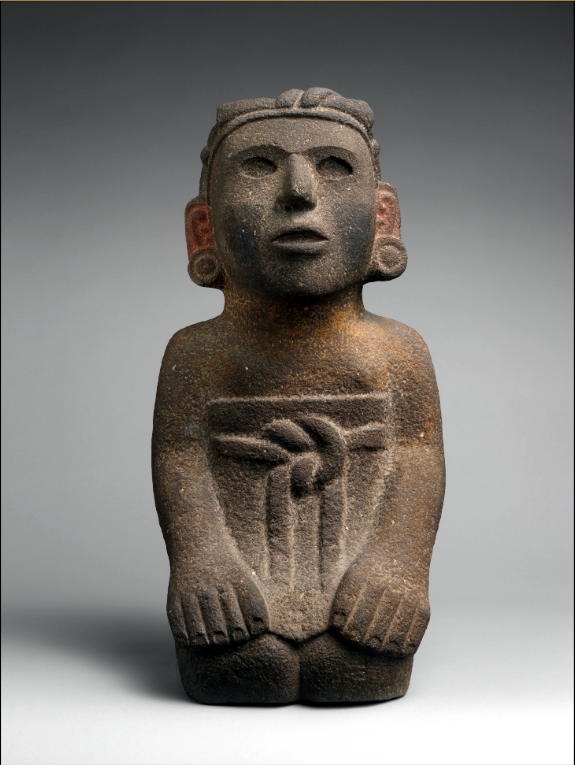 Illustration : figure féminine à genoux XVe - début XVIe siècle. Culture aztèque, Mexique. Il est possible que cette statuette en pierre ait été habillée à des jours précis du calendrier rituel dans des costumes de divinité faits de tissu ou d'autres matériaux périssables.